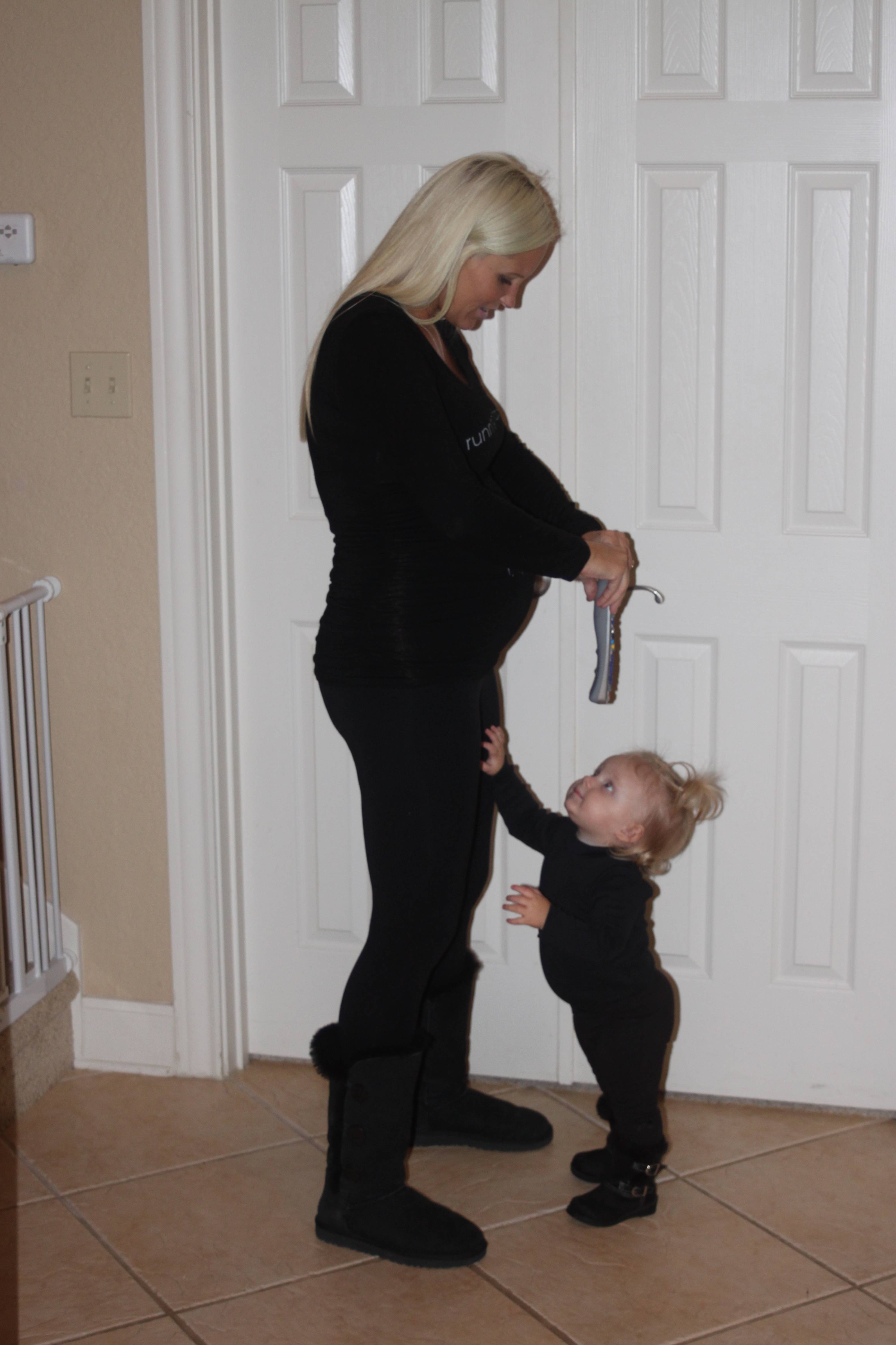 These days, both Landri and I are sporting growing bellies. In the picture to the left, Scott tried to capture this awesome phenomenon while I enticed her with one of her favorite items of all time (the TV remote). Our twin bellies seem to be more apparent in person though. This photo was also taken several weeks ago, before the Half Marathon, and I think both of us (me especially), have gotten much larger since then!