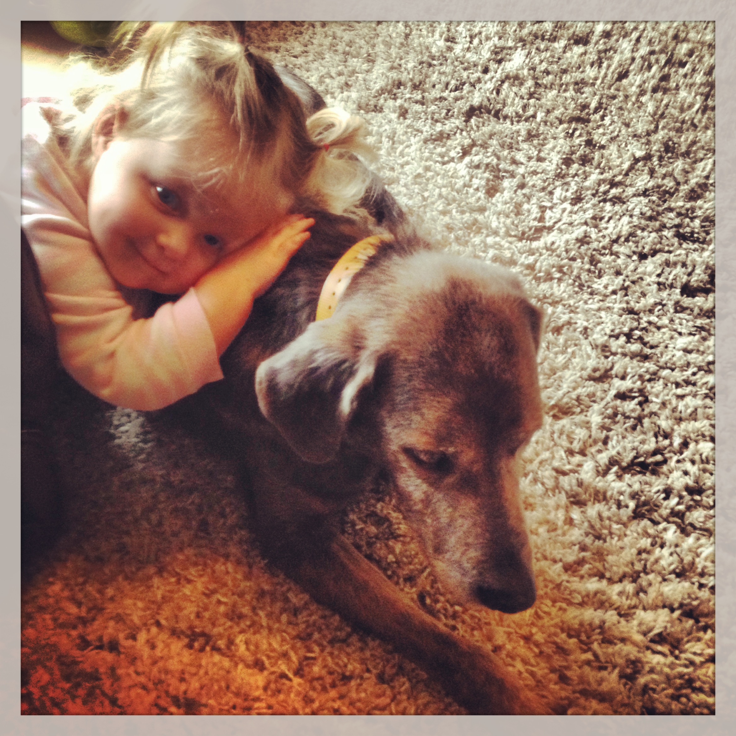 I imagine that I will be making a similarly titled post in the future…however, instead of involving an actual “puppy,” it will be a little boy in Landri’s class <Daddy winces here>. Back to this post though, who doesn’t love seeing a dog with a cute little human?! Landri has really become a fan of our dog Smoke. Bless his heart, Scott’s relentless beatings have finally taught him to tolerate her. Just kidding, we only had to swat him a few times for losing his patience with her. In all seriousness though, Smoke has really come a long way and puts up with quite a bit from her. Landri loves to pet and hug him, and sadly, pull his tail. She also likes to pretend she IS a dog, and sometimes licks the floor, her highchair or the tray of her highchair. It makes me CRAZY! Here’s a quick video of her petting and hugging on her brother Smoke! http://youtu.be/0yXitjCt0uQ
