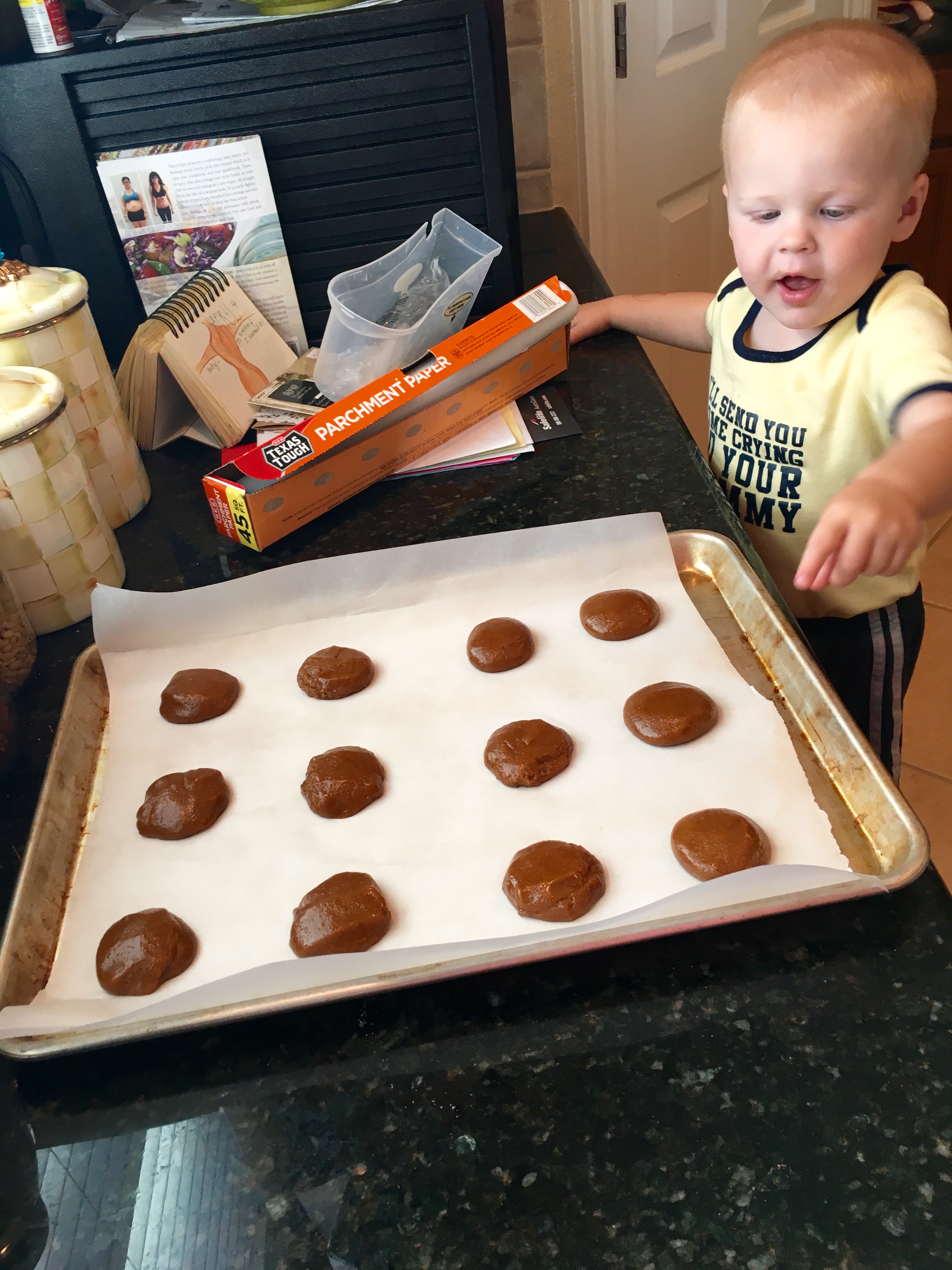 It seems like it’s been forever and a day since I’ve done any baking! And since I found myself today with only the boys (a huge shout out to Scott’s mom and dad for taking Landri), I decided to take advantage and do some fun things with Rex and Ty! First we went swimming at the gym after my yoga class and they both totally rocked it, doing floats, playing, and having fun. Then we went home and Ty promptly fell asleep, leaving me with some extremely precious one on one time with Rex! He agreed that making cookies would be a fabulous idea and we flipped through my vegan cookie cookbook to see what all we could make (without having to go to the store). I was delighted to see a recipe for Blackstrap Gingersnaps because our hotel in New Orleans for the marathon had a jar of these at the front desk and I’m pretty sure that Tara and I never walked by without grabbing some, LOL! I absolutely adore gingersnap cookies! So much for my raw diet today, eek!