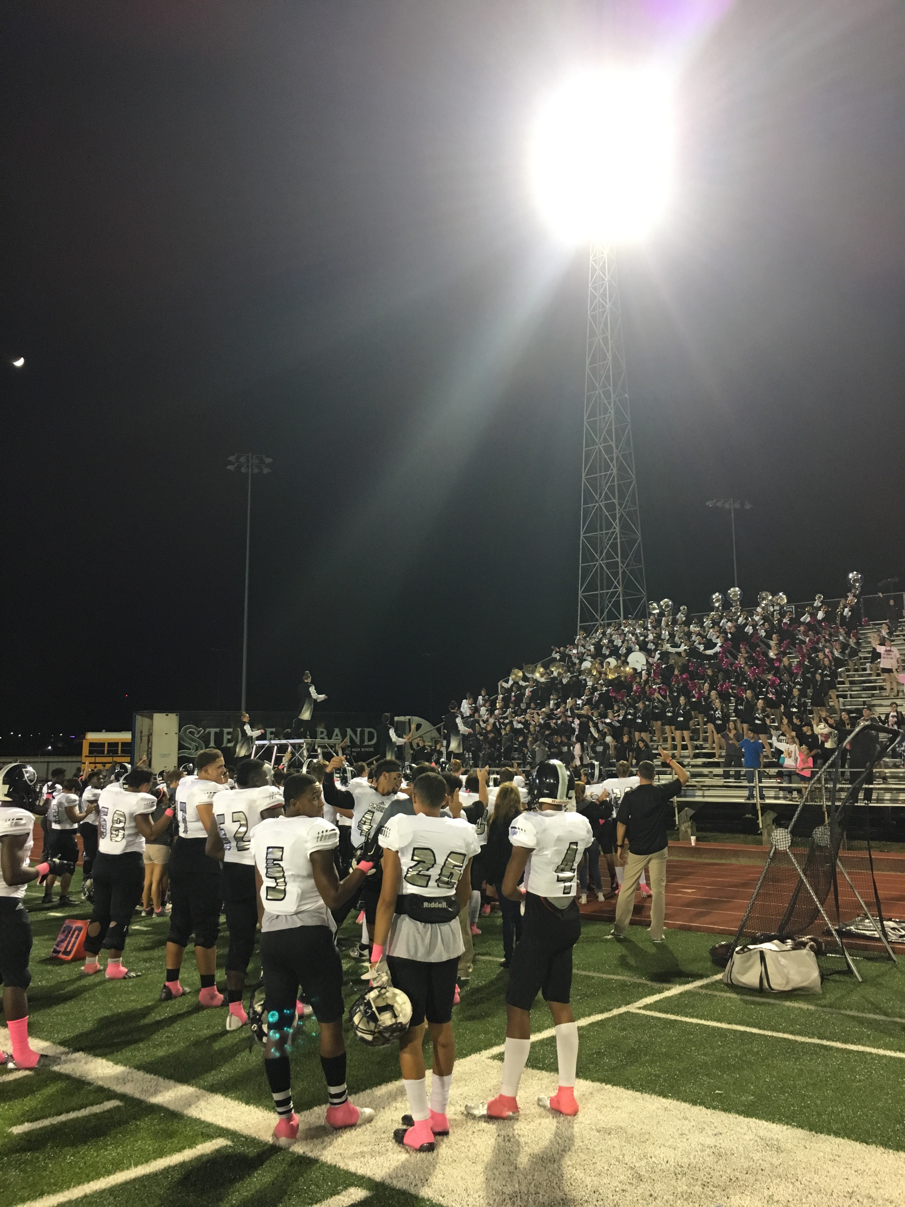 Last night Steele beat the New Braunfels Unicorns 38-7. I was kid-free again (getting spoiled here!) and enjoyed not getting slimed by blue sticky drool, not changing any “hot loads” as Rex likes to call them, and not having to police three little monkeys! Probably the most surprising thing about the evening was the cold front that blew in during the game. I hadn’t done my research as far as the forecast went and was ill prepared for the temperature drop and high winds. Luckily I had thought it was going to rain and brought a light rain coat which did help. Anyhow, next week we play Canyon at Canyon and my little squad will be ready to rumble! Until then…